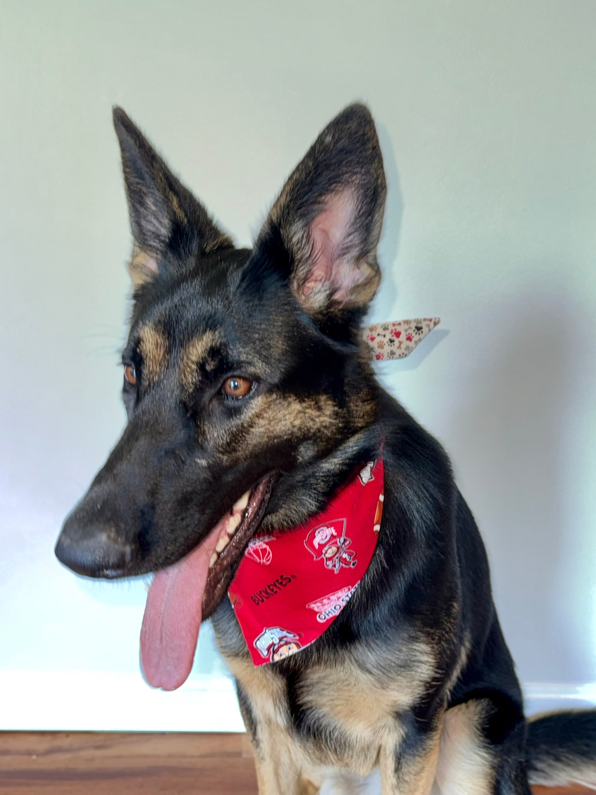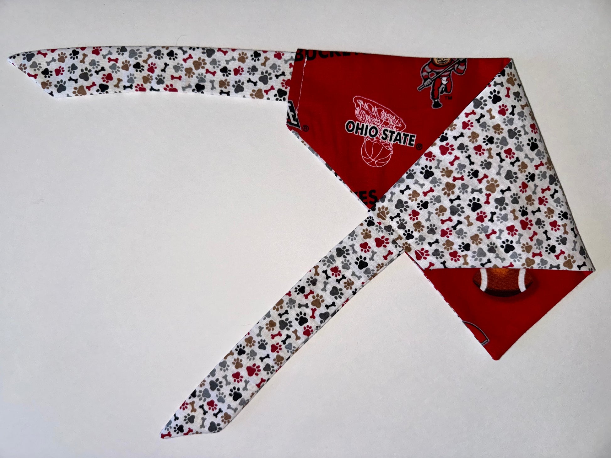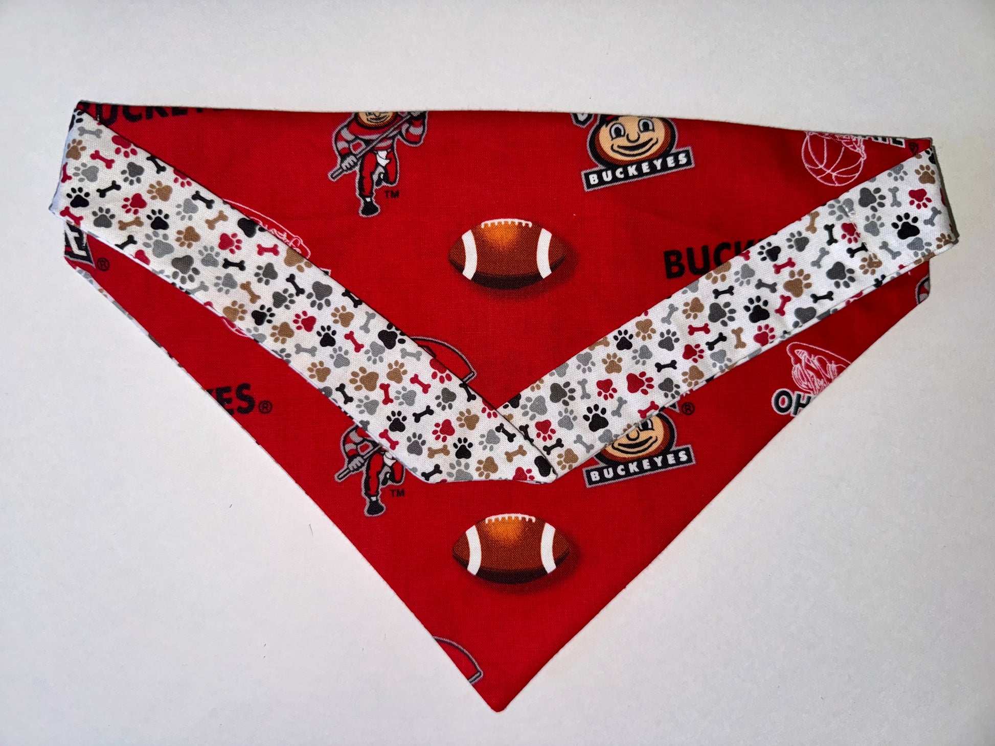 Show off your Ohio pride with this spirited bandana! Featuring footballs and basketballs inspired by your favorite Ohio college team, this design is perfect for game days, campus walks, or everyday wear. Let your pet join in the excitement and cheer on in style!