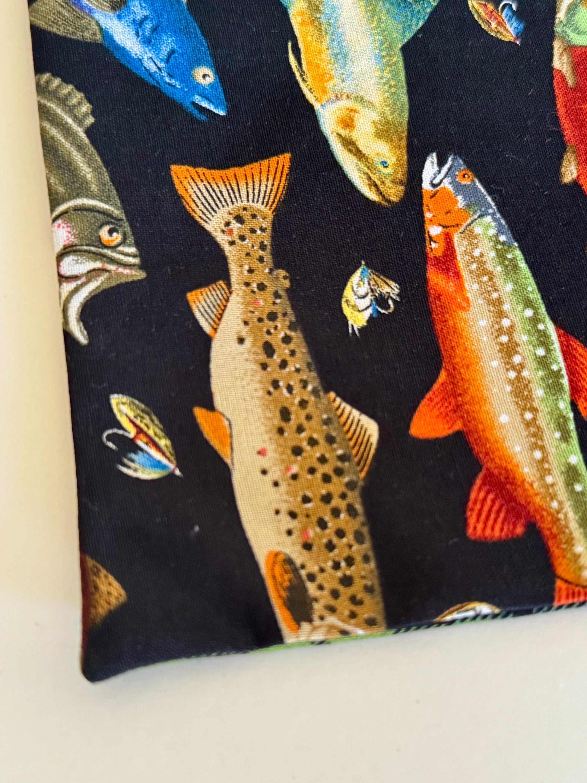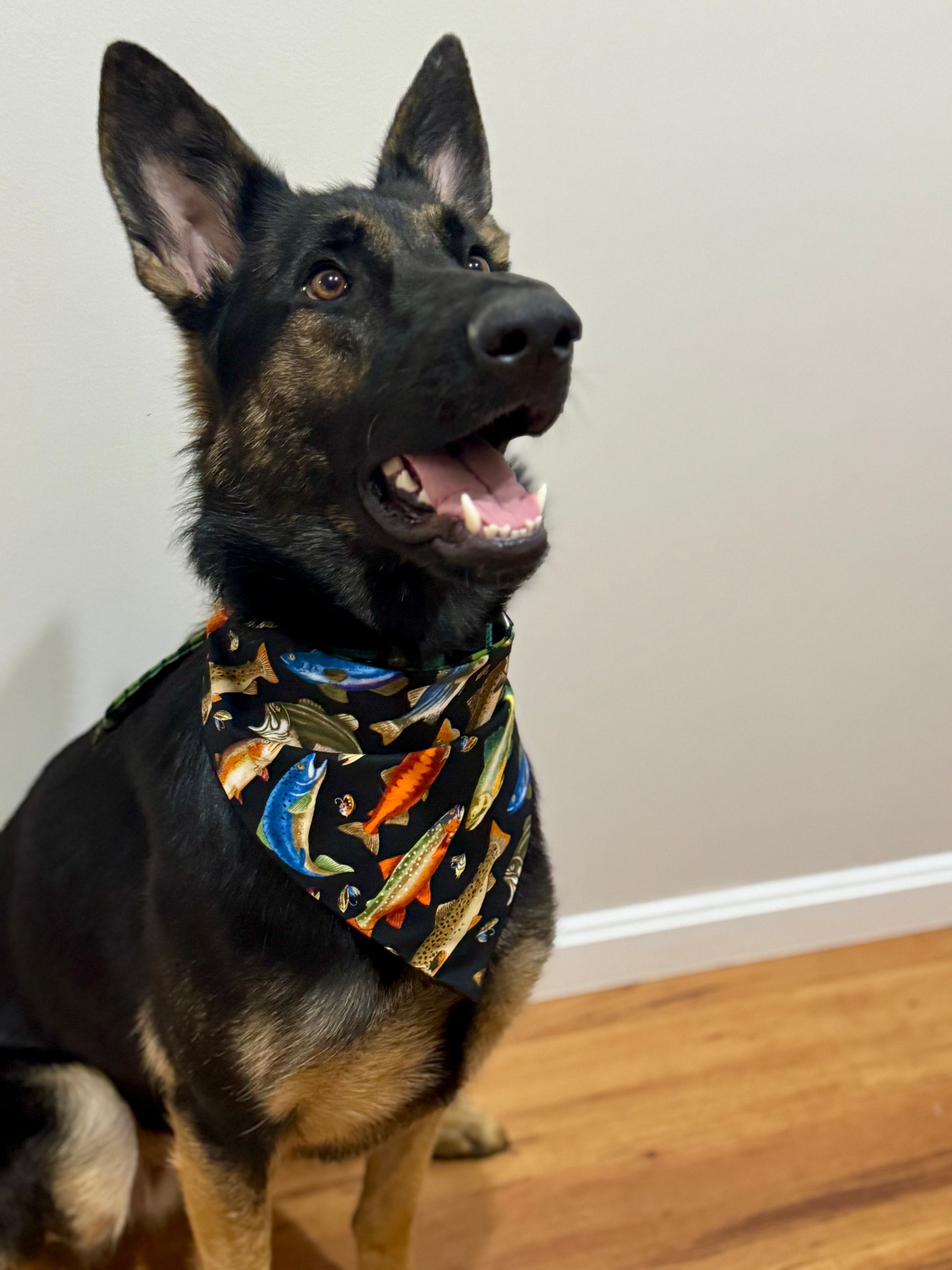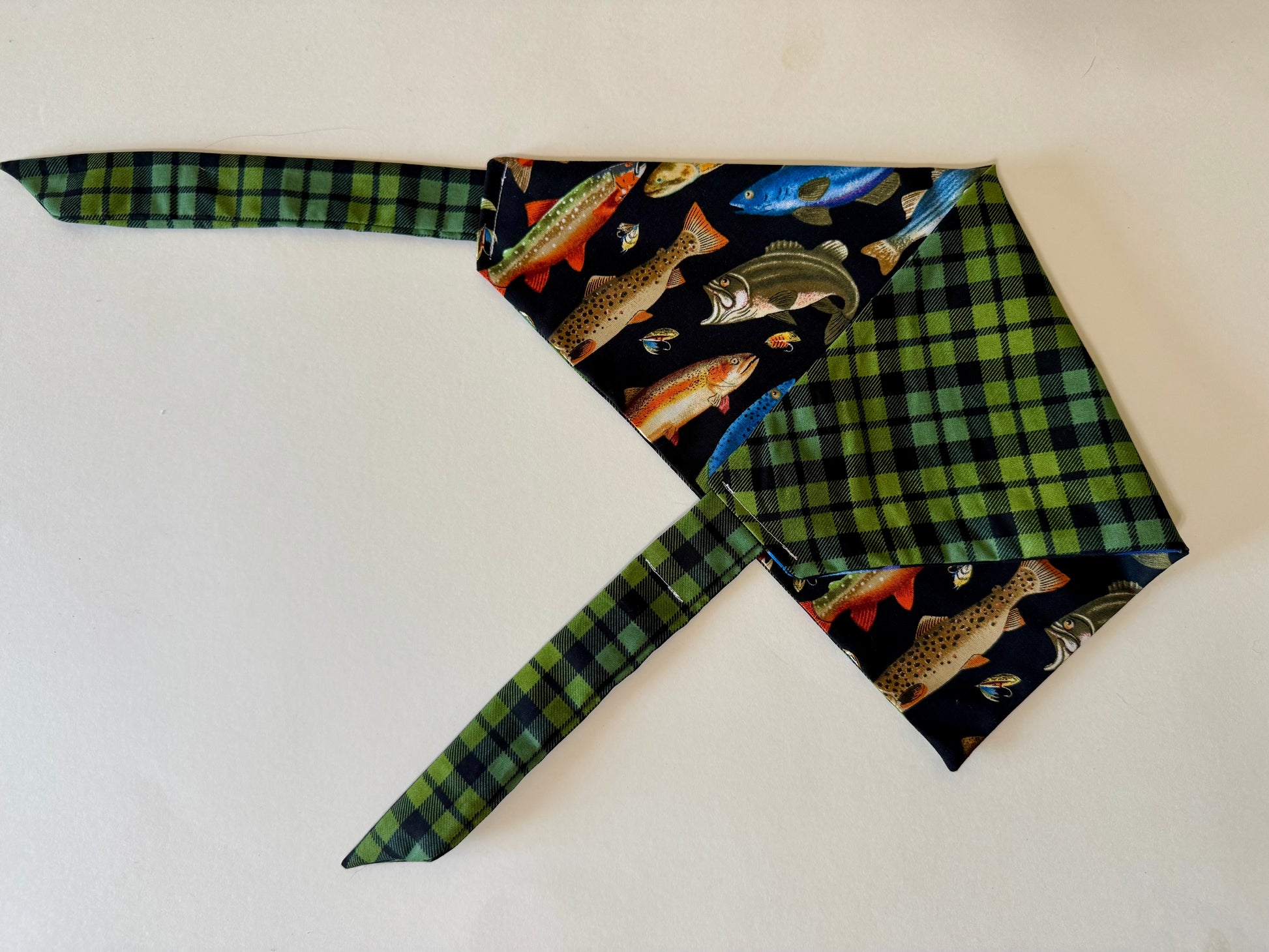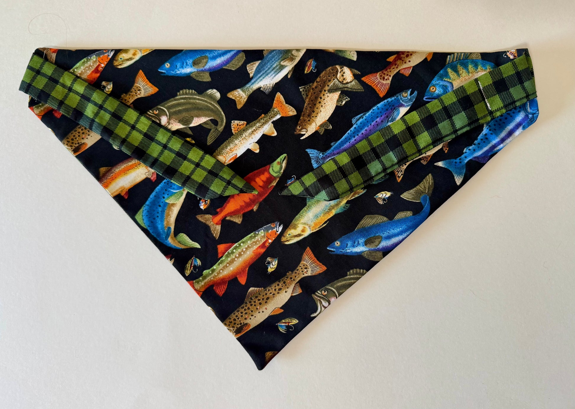 Maya’s Gone Fishing features a colorful, playful fish pattern paired with a classic green plaid backing — perfect for pets that love outdoor adventures, lake days, and sunny strolls by the water 🎣🐾