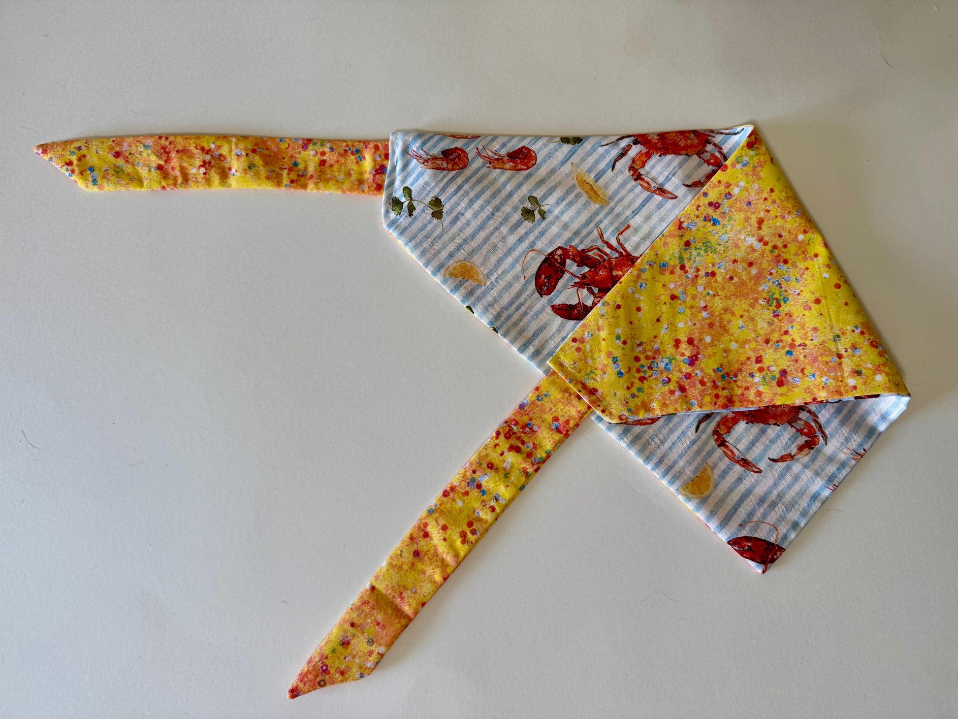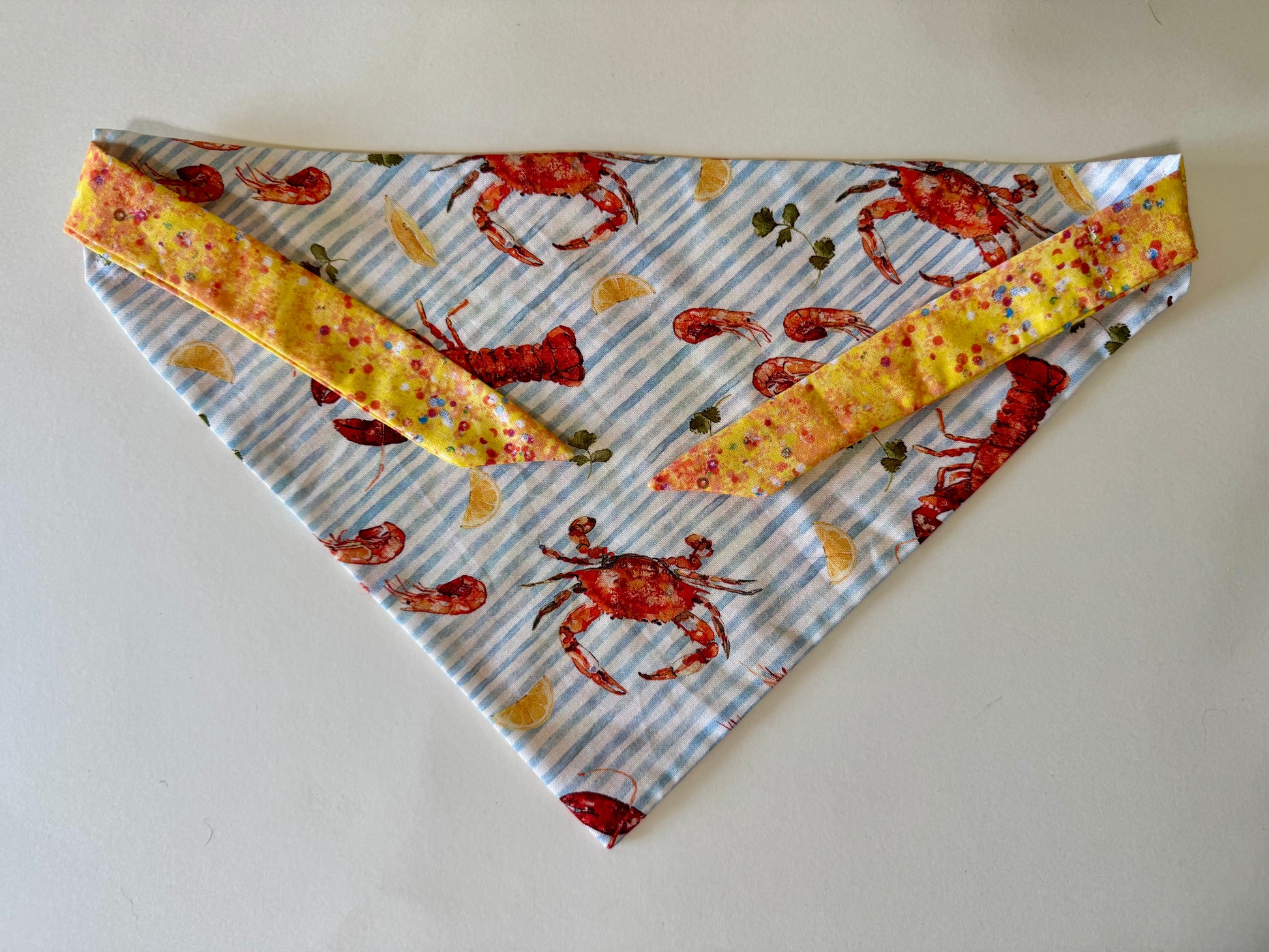 Maya’s Seafood Picnic features a playful seafood print paired with a bright yellow confetti fabric — the perfect cheerful bandana for sunny walks, beach days, and all your pet’s summertime adventures 🦀🐟☀️