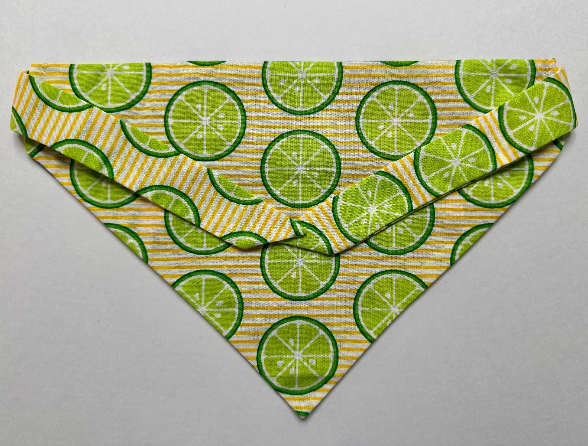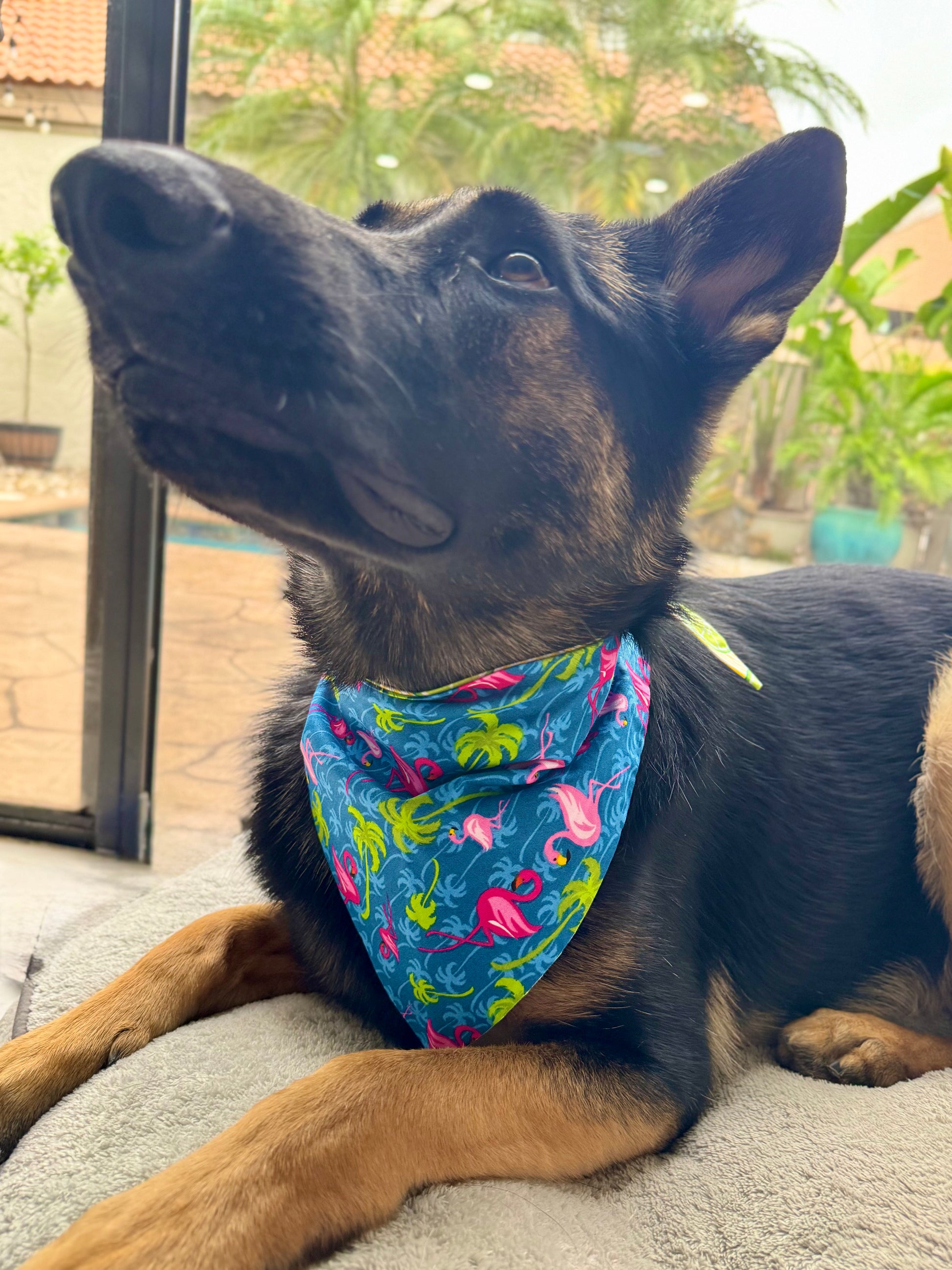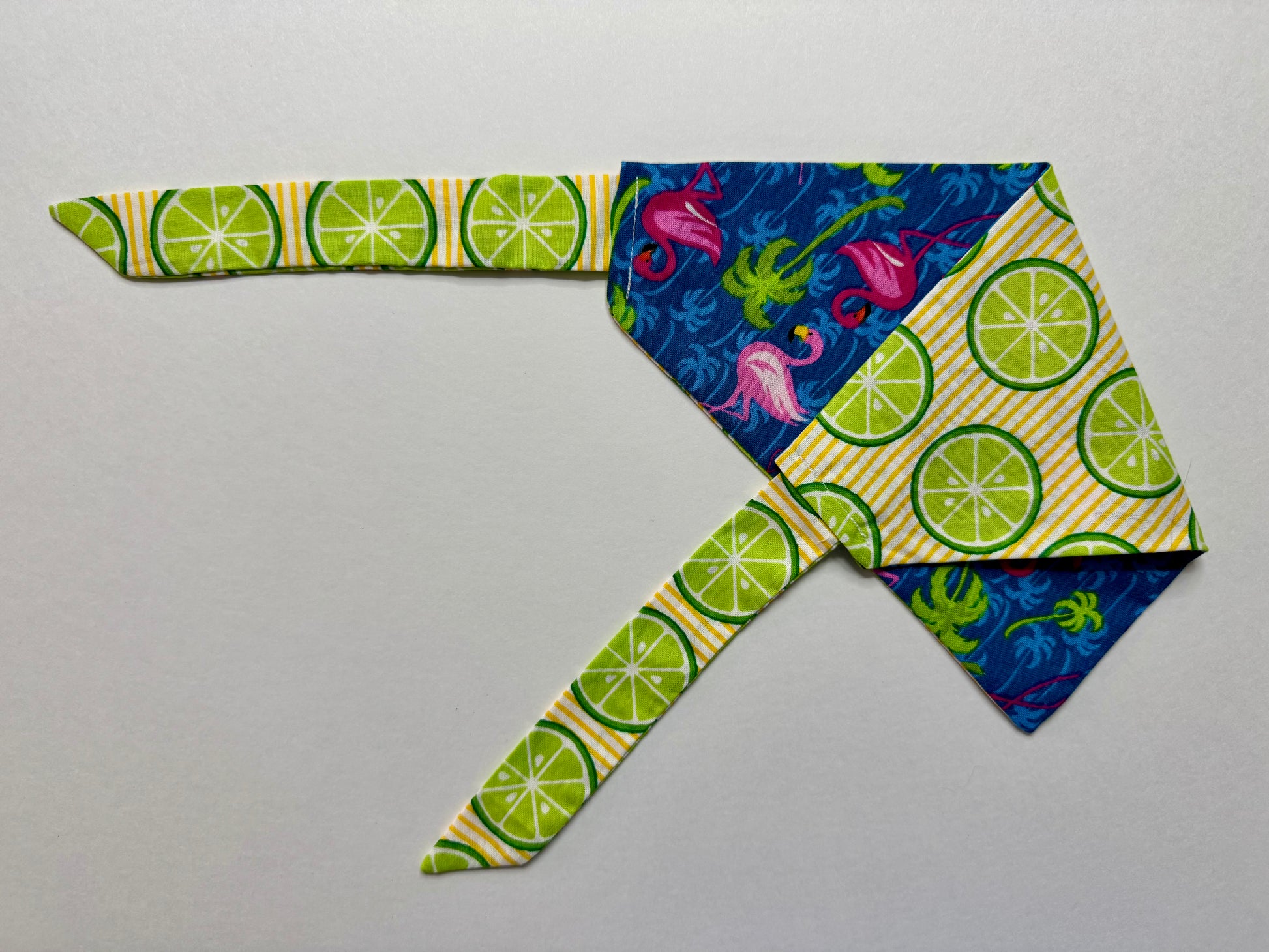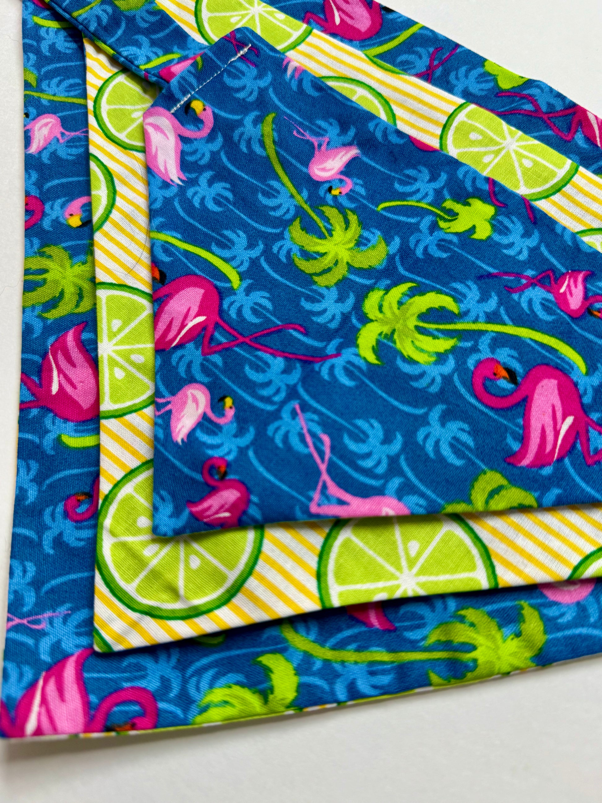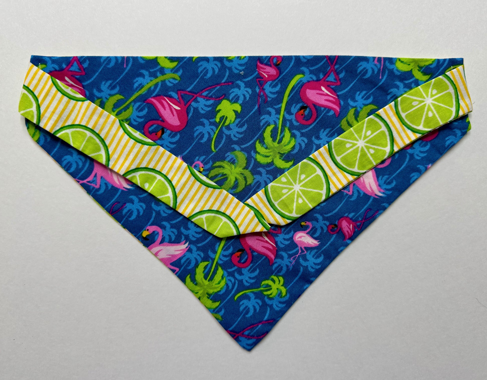 This fun, summer design is perfect for a pool day. Featuring flamingos, palms, and limes; this bandana will make your pet the hottest around! Reversible.