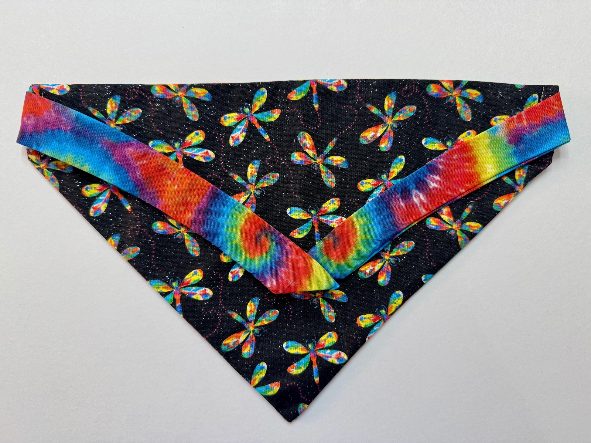 This sparkly dragonfly and tie dye bandana is perfect for summer activities! Reversible.